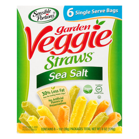 Vegetable and potato snack. No artificial flavors or preservatives. 0 mg cholesterol. 0 g trans fat. Certified Gluten-Free. Vegan. 30% less fat than leading potato chips (Per 1 oz Serving Fat: This Product: 7 g; Leading Potato Chip: 10 g). Non GMO. 6 single serve bags. Sea Salt. Snack smart. Resist less: What makes our snacks so irresistible? The combination of garden grown potatoes, ripe vegetables, and 30% less fat than the leading potato chip provides a better-for-you snack. Next, we delicately season them with sea salt. Now you can satisfy your snack cravings in a smart and whole-some way. Snack more. Guilt less: Our straws are not quite a chip, crisp, or stick. These airy, and crunchy straw snacks allow for 38 straws per serving! That is why we call ourselves sensible portions. 38 straws per serving. www.sensibleportions.com. Instagram. Facebook. Show how much like us (hashtag)veggieveggiegood. If you are not completely satisfied please call: 800-913-6637 www.sensibleportions.com . What is your favorite flavor? These tempting snacks also come in other varieties such as garden veggie straws sea salt apple straws cinnamon, and garden veggie straws zesty ranch or garden veggie wavy chips sea salt.