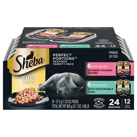 6 Twin-Packs Gourmet Salmon Entree. 6 Twin-Packs with Sustainable Tuna. 24 servings. No artificial flavors or preservatives (Trace amounts may be present due to cross-contact during manufacturing). Two fresh meals. Zero messy leftovers. Made without grains or corn (Trace amounts may be present due to cross-contact during manufacturing). sheba.com/sustainability. Questions or Comments? 1-800-525-5273. Sustainably sourced fish. We believe that truly irresistible food comes not just from expert preparation, but from select ingredients that are sourced with care. Therefore, the Sheba brand is proud to use only sustainably sourced fish in all its recipes. Visit sheba.com/sustainability for details. Made in the USA with the finest ingredients from around the world. Gourmet Salmon Entree: Calorie Content (Calculated): 783 kcal ME/kg, 29 kcal ME/Tray. Sheba Cuts in Gravy Gourmet Salmon Entree is formulated to meet the nutritional levels established by AAFCO Cat Food Nutrient Profiles for all life stages. With Sustainable Tuna: Calorie Content (Calculated): 838 kcal ME/kg, 31 kcal ME/Tray. Sheba Cuts in Gravy with Sustainable Tune is formulated to meet the nutritional levels established by AAFCO Cat Food Nutrient Profiles for all life stages.