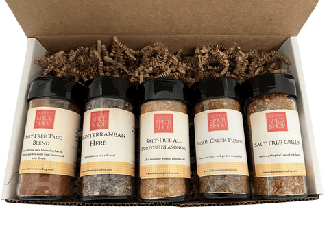 2.2 oz. Jar Salt Free Grill'n, 1 oz. Jar Mediterranean Herb, 2 oz. Jar Salt-Free All Purpose Seasoning, 1.7 oz. Jar Fossil Creek Fusion, 2 oz. Jar Salt-Free Taco Blend