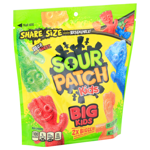 Per 5 Pieces: 100 calories; 0 g sat fat (0% DV); 20 mg sodium (1% DV); 22 g total sugars. Contains a bioengineered food ingredient. Sour then sweet. 2x bigger! Than original sour patch kids. Sour. Sweet. Gone. Fill height after settling. www.sourpatchkids.com. Join our crew: Instagram. Facebook. Twitter. Questions? Call 1-800-524-2854. www.sourpatchkids.com. Make your custom mix! Choose up to 8 different flavors only (at)sourpatchkids.com. Resealable! Made in Canada.