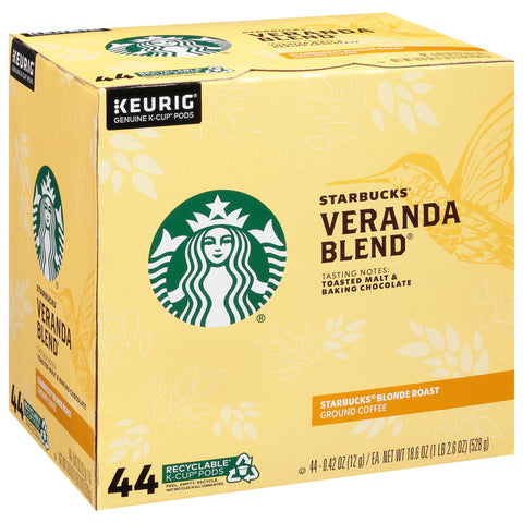 Genuine K-Cup pods. Tasting Notes: Toasted malt & baking chocolate. The Story of Veranda Blend: In Latin America, coffee farms are often run by families, with their own homes on the same land where their coffee grows. We've sipped coffee with these farmers for decades, sitting on their verandas, overlooking the lush beauty of the coffee trees rolling out in the distance. Most times it was a lightly roasted coffee like this one. It took us more than 80 tries to get it right-mellow and flavorful. Tasting Notes: Toasted malt & baking chocolate. Subtle with delicate nuances of soft cocoa and lightly toasted nuts. The Starbucks Roast: Each coffee requires a slightly different roast to reach its peak of aroma, acidity, body and flavor. We classify our coffees in three roast profiles, so finding your favorite is easy. Blonde. 100% arabica coffee. starbucks.com/athome. www.keurig.com. how2recycle.info. Find us on facebook.com/Keurig or twitter.com/Keurig. To learn more, visit us at starbucks.com/athome. For brewer inquiries contact: 1-866-901-Brew/1-866-901-2739; www.keurig.com. Starbucks Rewards: Let us treat you - join Starbucks Rewards Today: starbucks.com/morestars. Committed to 100% Ethical Coffee Sourcing in partnership with Conservation International. Starbucks.com/social-impact. This carton is made with recycled material. Recyclable (Not recycled in all communities) K-Cups pods. Peel, empty, recycle. Only Genuine K-Cup Pods are optimally designed by Keurig for your Keurig coffee maker to deliver the perfect beverage in every cup. Peel: Starting at puncture, peel lid and dispose. Empty: Compost or dispose of grounds. (Filter can remain). Recycle: Check locally (Not recycled in all communities) to recycle empty cup. Visit keurig.com/recyclable to learn more.