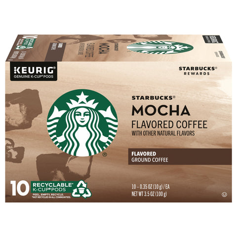 Tasting Notes: Luscious & chocolaty. Smooth with just the right amount of chocolaty richness. Mocha flavored coffee with natural other flavors. Keurig: Genuine K-Cup pods. The Crafting of Great Taste: Combining our passion for great coffee and a taste for fine chocolate, we've created a precise flavor balance like that of an experienced baker. This unique blend of Starbucks medium roast beans and cocoa notes creates a richness you can indulge in every day. Only Genuine K-Cup pods are optimally designed by Keurig for your Keurig coffee maker to deliver the perfect beverage in every cup. starbucks.com/social-impact. how2recycle.info. www.Keurig.com. starbucks.com/athome Find us on Facebook.com/Keurig or Twitter.com/Keurig. To learn more, visit us at starbucks.com/athome. For brewer inquiries contact: 1-866-901-BreWith 1-866-901-2739. www.Keurig.com. Starbucks Rewards: Earn Stars with your receipt on any qualifying purchase. Visit starbucks-stars.com for details. This carton is made with recycled material. Recyclable (Not recycled in all communities) K-Cup pods. Peel; empty; recycle. Peel: Starting at puncture, peel lid and dispose. Empty: Compost or dispose of grounds. (Filter can remain). Recycle: Check locally (Not recycled in all communities) to recycle empty cup. Visit Keurig.com/recyclable to learn more. Committed to 100% Ethical Coffee Sourcing in partnership with Conservation International. starbucks.com/social-impact.