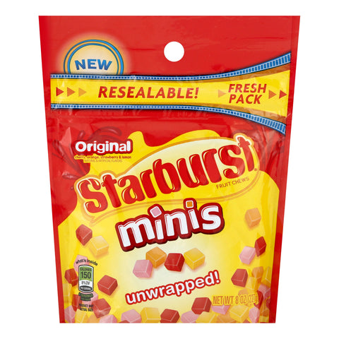 Cherry, Orange, Strawberry & Lemon. Natural & artificial flavors. Unwrapped! New. Resealable! What's Inside: 150 calories (8% DV) per serving. 6 servings per pack. What's Inside - per Serving (About 6 servings per pack): 150 calories (8% DV); 2 g total fat (3% DV); 1 g sat. fat (5% DV); 28 g sugars (No DV defined); 55 mg sodium (2% DV). GDA's are based on a 2,000 calorie diet. To learn more visit www.starburst.com. Dispose of properly. Do your part! www.starburst.com. Questions? Comments? Call 1-800-Wrigley (1-800-974-4539). Made in Mexico.
