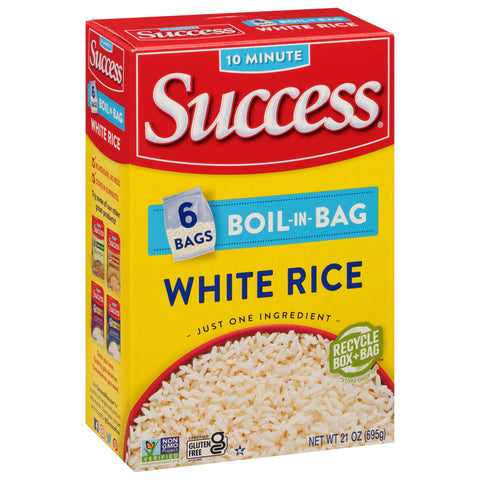 Certified gluten free. 50% more than our regular size bags! Non GMO Project verified. nongmoproject.org. 10 minute. Just one ingredient. Enjoy the original boil-in-bag white rice that delivers the same high quality taste and texture as long cook rice but in half the time. Success White Rice promises perfect, fluffy rice every single time. No measure, no mess, Guaranteed to always cook right! Success is in the bag. Taste you love. Quality you deserve. Convenience you need. Our guarantee! If Success Rice doesn't cook perfectly every time, we will refund the full purchase price. Limit one refund per household. Just send the entire bottom panel along with the specific reason for your refund to: Success Rice Refund, Consumer Relations PO Box 5400, Largo, FL, 33779. Please have package available when calling. Monday-Friday 8am to 4pm Central Time. Call: 1-800-226-9522. SuccessRice.com. SuccessRice.com. how2recycle.info. Share your recipes and thoughts: (at)SuccessRice. Facebook. Instagram. Twitter. Pinterest. Find this and many other recipes at SuccessRice.com. Visit SuccesRice.com for a variety of recipes and product information. Try some of our other great products. Quinoa Tri-Color. Brown Rice. Jasmine. Basmati Recycle box + bag (Store drop-off). We are committed to respecting the environment through sustainable business practices. Take part in conservation efforts by recycling Success boxes curbside and bags via store drop-off. Sustainable Forestry Initiative. Certified Sourcing. www.sfiprogram.org. Grown in the USA.