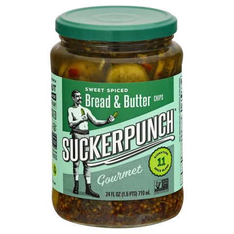 Gluten free. Yes vegan. Non GMO Project verified. nongmoproject.org. 11 signature spice blend. Gourmet pickles. Knockout flavor. Our pickles pack a punch for knockout flavor. Only the best small cucumbers (for extra snap) and fresh-packed with our signature 11-spice blend. Look below. Undisputed better bread & butter sweetly spiced just right. The stand up choice for sides, snacks or parties. No HFCS. suckerpunchgourment.com. Learn more at suckerpunchgourment.com. Packed in the U.S.A.