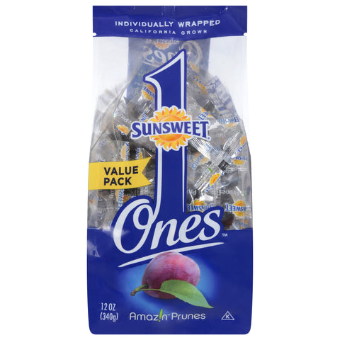 100 calories per serving. Good source of fiber. Amazin Prunes. Individually wrapped prunes. What could be better than a sweet and nutritious treat for only 100 calories? Sunsweet Ones go wherever your busy life takes you: in the car, at the park, at the gym. These individually wrapped, delicious Amazin Prunes make it easy to enjoy a satisfying snack. Over 1 billion enjoyed! The Taste is in The Shape: Only Sunsweet can bring you our patented pitting process that creates tastier, more tender fruit with less pits and the plump round shape we're known for. For Questions or Comments Call: 1-800-417-2253, 9 AM- 6 PM EST, Mon-Fri. Fruit & veggies more matters. Please recycle. Diabetic Exchange: 2 fruit. Dried fruits have fiber along with carbohydrates & can be a good choice in your diabetic meal plan. California grown. Product of USA.