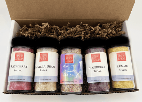 Gift Box Includes: 3.2 oz Jar of Vanilla Bean Sugar, 3.4 oz Jar of Magical Unicorn Sugar, 2.3 oz Jar Blueberry Sugar, 3 oz Jar Raspberry Sugar, 2.5 oz Jar Lemon Sugar