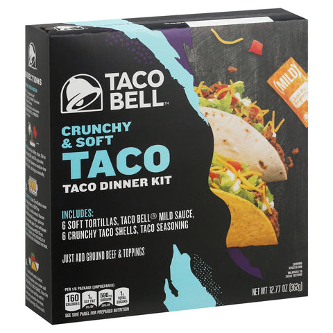 Includes: 6 soft tortillas, Taco Bell Mild Sauce, 6 crunchy taco shells, taco seasoning. Per 1/6 Package (Unprepared): 160 calories; 1 g sat fat (5% DV); 590 mg sodium (26% DV); 1 g total sugars. See side panel for prepared nutrition. Just add ground beef & toppings. Make any night a Taco Bell Night. Kraftheinzcompany.com. Scan or call 1-800-695-8226 for more food information. Visit us at: kraftheinzcompany.com; 1-800-695-8226. Pick up everything you need to complete Taco Night! This carton is 100% recyclable. Recycling programs for this package may not exist in your area.