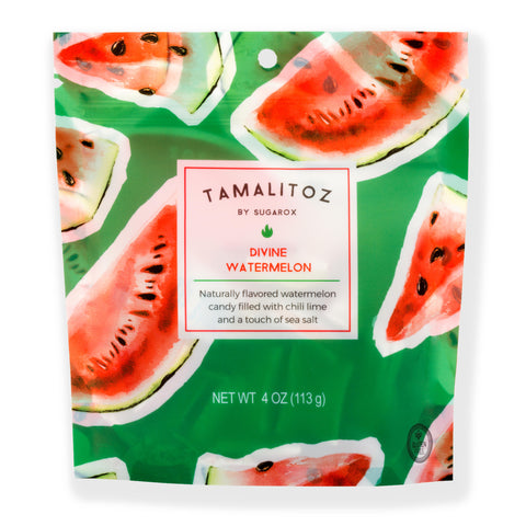 NATURALLY FLAVORED WATERMELON RIBBON CANDY PILLOWS FILLED WITH CHILI LIME AND A TOUCH OF SEA SALT. SITTING ON A SUN DRENCHED VERANDA OVERLOOKING THE MEXICAN PACIFIC OCEAN INDULGING WITH A PLATE OF FRESH WATERMELON SPRINKLED WITH CHILI LIME AND SEA SALT, SOUNDS LIKE HEAVEN RIGHT? THIS WAS THE FLAVOR THAT INSPIRED OUR DIVINE WATERMELON TAMALITOZ.