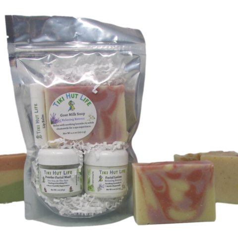 Relaxing Retreat Set Goat Milk Soap, Relaxing Retreat; Coconut Oil, Olive Oil, Goat Milk, Cocoa Butter, Sodium Hydroxide, Sweet Almond Oil, Shea Butter, Castor Oil, Fragrance & Mica. Facial Lotion Relaxing Retreat; Distilled Water, Emulsifying Wax, Argan Oil, Jojoba Oil, Mango Butter, Cetyl Alcohol, Vitamin E, Fragrance, Phenoxyethanol Caprylyl, Glycol & Sorbic Acid (All-Natural Paraben & Formaldehyde-Free Preservative). Powder Facial Mask Sea You At The Spa; French Green Clay, Aloe Vera, Goat Milk. Lip Balm Apple Lagoon; Coconut Oil, Mango Butter, Beeswax, Flavor Fragrance.