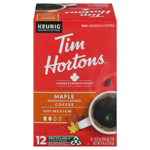 100% Arabica coffee. Artificially flavored. Keurig - Genuine K-cup pods. Canada's favorite coffee (based on December 2020 consumer surveys of Canadian coffee drinkers). Est 1964. For consumer use only. Individual single serve k-cup pods not for resale. 50 years of coffee expertise. Tim Hortons maple-flavored coffee is a perfectly balanced medium roast with a hint of maple sweetness. The signature flavor in every cup of Tim Hortons coffee is created using a unique blend of 100 % premium Arabica beans, roasted with care to deliver the consistent taste of Tim Hortons every time. Only genuine k-cup pods are optimally designed by Keurig for you Keurig coffee maker to deliver the perfect beverage in every cup. how2recycle.info. Timhortons.com/us/coffee. Keurig.com/genuinek-cuppod. www.keurig.com. For Keurig coffee maker inquires: Keurig green mountain, Inc. 1-866-901-2739. www.keurig.com. To learn more, visit: Timhortons.com/us/coffee. To learn more, visit Keurig.com/genuinek-cuppod. Recyclable (Not recycled in all communities) K-Cup Pods. Peel, empty, recycle. Caution: Pod is hot. Allow to cool after use. Peel: Starting at puncture, peel lid and dispose. Empty: Compost or dispose of grounds. (Filter can remain). Recycle: Check locally (Not recycled in all communities) to recycle empty cup. Visit Keurig.com/recycleble to learn more. FSC: Recycled: Packaging made from recycled material. www.fsc.org. Made in Canada.