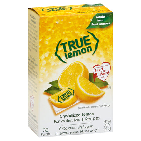 For water, tea & recipes. Made from Red Lemons. 1 million meals to help feed the need. Feeding America. See side panel for more info. One packet = taste one wedge. Use just like a lemon wedge! We love fresh-squeezed lemon taste so much that we wanted to enjoy it wherever we go, so we made True Lemon. Made with lemon oil and juice, True Lemon is the most convenient way to add fresh-squeezed lemon taste to your water, tea and recipes. Help Us Deliver 1 Million Meals: 1 in 8 Americans don't always know where their next meal is coming from. True Citrus has partnered with Feeding America & to donate the equivalent of over 1.2 million meals this year. You can help One click = one meal (To reduce fizzing & avoid overflow, pour carbonated beverage into glass adding True Lemon). Just go to our website at TrueCitrus.com/FeedingAmerica and enter code 1097900125. For every code entered, True Citrus will donate the cost for Feeding America to supply 1 meal ($1 helps provide 11 meals by Feeding America on behalf of local food banks. True Citrus guarantees a minimum of 1.232 million meals (monterey equivalent of $112,000) to Feeding America and member food banks during the program year) through its network of local Mod banks. 0 calories, 0 g sugars. Unsweetened, non-GMO. Each packet equals the taste of 1 lemon wedge. Only 3 ingredients. No artificial sweeteners or preservatives. No artificial colors. Gluten free. To find out all the fabulous ways to use True Lemon and get special offers, visit.TrueCitrus.com. Be healthy. Be happy. Be true. We're in the mix! Facebook, Twitter & Instagram. Satisfaction Guarantee: We offer a 100% satisfaction guarantee. If you're not completely happy with True Lemon (or just have a question/comment), call us at 866-885-3666. To find out more, visit TrueCitrus.com/FeedingAmerica. Visit www.TrueCitrus.com for info, health tips & more. Please recycle. Carton made from 100% recycled paperboard. Minimum 35% post-consumer content.