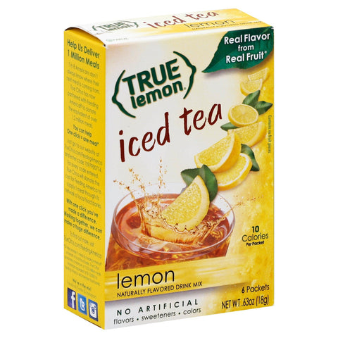 Naturally flavored drink mix. Real flavor from real fruit. 10 calories per packet. No artificial flavors; sweeteners; colors. Contains no fruit pieces. Iced Tea Goodness Any Time: Nothing says refreshing more than iced tea. Made with simple & clean ingredients, our Lemon Iced Tea balances premium black tea, the fresh-squeezed taste of lemon and some natural sweetness so now you can enjoy refreshing iced tea goodness anytime, anywhere. Our True Promise: real flavor from real fruit; no artificial sweeteners or flavors; no preservatives; no artificial colors; gluten free; non-GMO. 1 million meals to help Feed the Need. Feeding America. See side panel for more info. Satisfaction Guarantee: We offer a 100% guarantee of satisfaction. If you're not completely satisfied (or you just have a question/comment), call us toll-free at 866-885-3666 or email us. Help Us Deliver 1 Million Meals: 1 in 8 Americans don't always know where their next meal is coming from. True Citrus has now partnered with Feeding America to donate the equivalent of over 1.2 million meals. You can help. One click = one meal ($1 helps provide 11 meals by Feeding America on behalf of local food banks. True Citrus guarantees a minimum of 1.232 million meals [monetary equivalent of $112,000] to Feeding America and member food banks). Just go to our website at TrueCitrus.com/Feeding America and enter code 1097900774. For every code entered, True Citrus will donate the cost for Feeding America to supply 1 meal through its network of local food banks. With one click you've made a difference. Working together, we can make a huge difference. To find out more, visit TrueCitrus.com/FeedingAmerica. We're in the mix! Facebook, Twitter & Instagram. Facebook. Twitter. Instagram. No preservatives. Gluten free. Visit www.TrueCitrus.com for info, health tips & more.