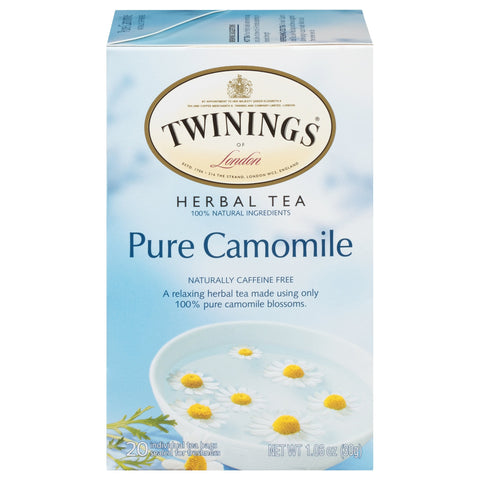 Individual tea bags sealed for freshness. A relaxing herbal tea made using only 100% pure camomile blossoms. Naturally caffeine free. Non GMO Project verified. nongmoproject.org. By appointment to her majesty Queen Elizabeth. Tea and coffee merchants R. Twining and company limited, London. Twinings of London. Estd. 1706. 216 The Strand, London WC2, England. 100% natural ingredients. A relaxing herbal tea expertly blended using only 100% pure camomile blossoms to deliver a soothing tea with a soft, floral aroma and smooth taste. Herbal Teas Fresh, Flavorful & Aromatic: For over 300 years, Twinings has been sourcing and blending the finest, high-quality teas from around the globe to ensure that your tea has the perfect balance of tea taste, flavour and aroma. Twinings blends to perfection the finest herbs, fruits and spices to give you a line of great-tasting herbal teas with mouth-watering flavours, fresh tastes and irresistable aromas. Whatever your mood - there's a blend for every occasion. The Twinings Story: In 1706 Thomas Twining began selling fine tea from an English storefront in The Strand, London. Today, Twinings still sells some of the world's best teas from the original store and in more than 100 countries throughout the world. www.twiningsusa.com. For questions or comments, please contact us at: www.twiningsusa.com or call us at 1-800-803-6695. If you enjoy Twinings Pure Camomile, we recommend that you try other Twinings Herbal Teas including Camomile, Honey & Vanilla and Nightly Calm. Enjoy all of Twinings premium teas, Classics: Traditional style black teas. Premium Blacks: Fine black teas with just the right amount of flavour. Chais: black teas blended with savoury spice flavours. Origins: From the world's best tea regions. Greens: Naturally refreshing teas with a smooth taste. Herbals: Caffeine free herbal & fruit flavour blends. Cold Brewed: refreshing iced teas that brew in cold water in just 5 minutes. To discover more about these fine teas, please visit us at www.twiningsusa.com. Product of Poland with expertly selected herbals grown in Germany, Chile, Egypt and other countries.