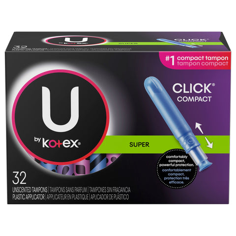 No. 1 compact tampon. Compact. Comfortably compact, powerful protection. Designed to keep up with you: comfortably compact; powerful protection; slim, smooth design. Pull until locks into place. Tampon Absorbency Ranges: Regular: 6-9 g; Super: 9-12 g; Super Plus: 12-15 g. These absorbency ranges and their corresponding terms are required to be used by all tampon manufacturers to indicate the amount of fluid absorbed using a standard laboratory test. Use the standardized absorbency ranges and terms to make comparisons between tampons of all manufacturers. Choose the minimum absorbency necessary to control your menstrual flow in order to reduce the risk of contracting TSS. UbyKotex.com. how2recycle.info. 1-800-335-6839 UbyKotex.com. Consumer Services, Kimberly-Clark Corp. Dept. KTUCS-32 P.O. Box 2020, Neenah, WI 54957-2020 USA. Proud US Partners: Alliance for period supplies with U by Kotex she can. Food or period products? Millions of women make choices like this due to lack of income. Get involved at: UbyKotex.com. Dispose in a trash receptacle. Dispose of properly. how2recycle.info Made in Mexico.