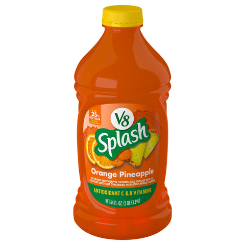 An orange and pineapple flavored juice beverage. With 5% vegetable juice from concentrate with other natural flavors. Gluten free. Antioxidant C and B vitamins. At least 25% less sugar than leading juice drink brands (per 8 fl oz: Leading shelf stable brands, 17 g; Splash 11 g). Contains a bioengineered food ingredient. The ingredient from corn in this product comes from a genetically modified crop. Pasteurized. how2recycle.info. Questions or comments? Call us at 1-800-871-0988.