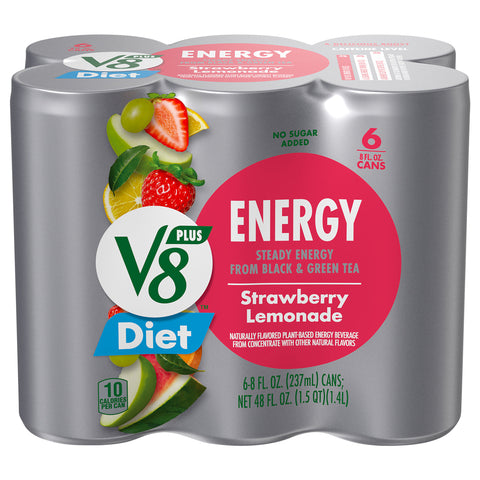 Naturally flavored plat-based energy beverage from concentrate with other natural flavors. 10 calories per can. Caffeine Level: V8 Plus Energy (8 oz) 80 mg. A leading energy drink (8.4 oz) 80 mg. A brewed cup of coffee (8 oz) 90 mg. Steady energy from black & green tea. Sweetened with a nonnutritive sweetener.