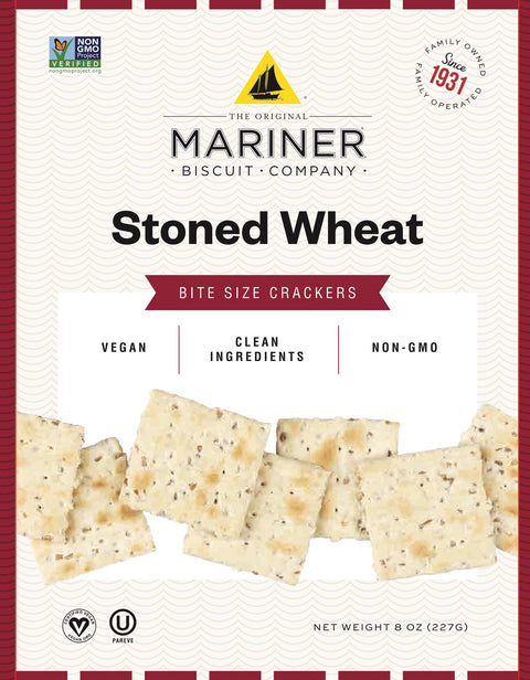 Mild baked small square shaped Wheat crackers, with a very slight nutty taste, topped with Sea Salt. Originally developed by Eastern European immigrants on their Western Canadian farms, stoned wheat crackers have long been a healthy addition to an everyday diet. Mariner's recipe is the perfect better-for-you snack, with all the convenience and none of the ingredient issues. And their subtle flavoring and interesting texture make them irresistible. The Original Mariner Biscuit Company's stoned wheat crackers are baked in a small seaside New England town and have received third-party certification of their Kosher, Vegan, and Non-GMO status. Enjoy both Original and Bite Size and let us know how you prefer yours.