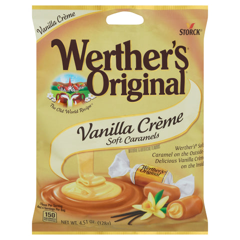 Werther's Soft Caramel on the outside-delicious vanilla creme on the inside. Natural & artificial flavors. 5 Pieces per Serving About 4 Serving per Bag: 150 calories per serving. The old world recipe. Storck part of the world. A long time ago, in the small European village of Werther, candy-maker Gustav Nebel created his finest candy. He used the best ingredients - real butter, fresh cream, white and brown sugars, a pinch of salt and a lot of time - to create a treasure worthy of being wrapped in gold. Because they turned out especially well, they were named Werther's Original in honor of the little village. Crafting this smooth, creamy caramel became a family tradition handed down through generations. Now indulge in Werther's Original Vanilla Creme Soft Caramels - rich, creamy caramels filled with indulgent vanilla creme. www.werthers-original. us,www.strock.us. Discover the softer side of Werther's Caramel. Werther's Cocoa Creme Soft Caramels. Made in Germany.