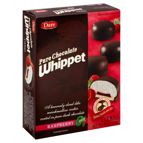 Quebec's favorite since 1927. Enrobed with pure chocolate. A heavenly cloud-like marshmallow cookie coated in pure dark chocolate. Artificially flavored; 0 g trans fat. Box made with 100% recycled fibres. Since its creation by the Viau family in 1927, the irresistibly sinful taste of Dare Pure Chocolate Whippet has been Quebec's favorite cookie for generations! Whippet is a heavenly cloud-like marshmallow cookie that is smothered in a pure dark chocolate for a taste that is sure to satisfy your every desire. Questions or comments? 1-800-668-3273 - 9 a.m. - 5 p.m. Eastern time. Weekdays. Visit us at our website: www.darefoods.com. Product of Canada.
