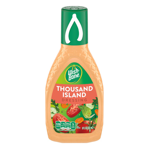 Great on sandwiches! No high fructose corn syrup. Gluten free. Wish-Bone's Thousand Island Dressing is great for salads, dipping and even spreading on sandwiches! Use Wish-Bone Thousand Island to create the perfect classic Rueben sandwich that's packed with flavor! Wish-Bone's unique blend of zesty tomato, tangy sweet relish and spices is a delicious addition to any meal! For delicious recipes visit wish-bone.com. Rich in omega 3 ALA (contains 660 mg ALA per serving which is 41% of the 1.6 g daily value for ALA). Questions or comments? Please call 1-800-343-9024.