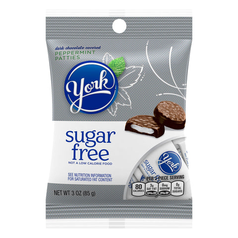 Dark chocolate covered. Per 2 Piece Serving: 80 calories; 3 g sat fat (15% DV); 0 mg sodium (0% DV); 0 g total sugars. 40 calories per piece. Not a low calorie food. See nutrition information for saturated content. Your favorite without the sugar. Variety and moderation are the keys to a balanced lifestyle, yet oftentimes, it is easier said than done. That's where York sugar free peppermint patties come in the great taste of York peppermint patties, but without the sugar. SmartLabel: Scan for more food information. Questions or comments? www.askhershey.com or 800-468-1714. Visit us at www.hersheys.com.